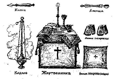 и пр. И, приступив к престолу (лицом к востоку), бьют пред ним три наземные поклона и целуют на нём лежащее евангелие, как бы Самого Господа, сидящего на престоле; целуют потом и сам престол и приступают к облачению себя в священные одежды, чтобы отделиться не только от других людей, но и от самих себя, ничего не напомнить в себе другим похожего на человека, занимающегося обыкновенными житейскими делами. И произнося: