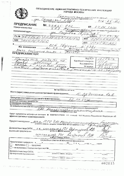 4. Предписание подрядчику о прекращении работ по сносу зданий в связи с отзывом разрешения Москомнаследия.