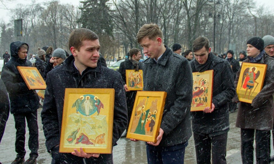 Люди идут по щиколотку в снегу, крестный ход практически опоясывает собор, и пения становится не слышно. Над шествием видны хоругви, знамя некой казачьей дружины, два «имперских» триколора. Многие участники хода держат иконки или белые розы, которые в какой-то момент раздавали у храмовых дверей.