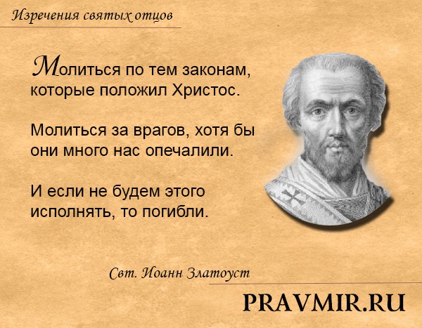 «Недовольно для спасения нашего молиться, если при том не будем молиться по тем законам, которые положил для сего Христос. Какие же Он положил законы? Молиться за врагов, хотя бы они много нас опечалили. И если не будем этого исполнять, то погибли мы, как видно из того, что было с фарисеем…».