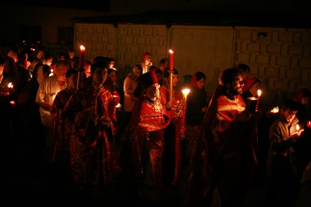 В храме было вообще не протиснуться. Мы еле успели купить свечки, когда началась служба и вскоре все потянулись на улицу: крестный ход. Люблю этот контраст: ночное глубокое небо и яркие рыжие фонари, отдаленный шум машин и стройное пение «Христос воскресе из мертвых», вереница крохотных огоньков свечей под сенью весенних деревьев. А впереди – нарядные, торжественные хоругви. И замирающее, ликующее ощущение: праздник приближается, он уже совсем близко, Христос воскрес!