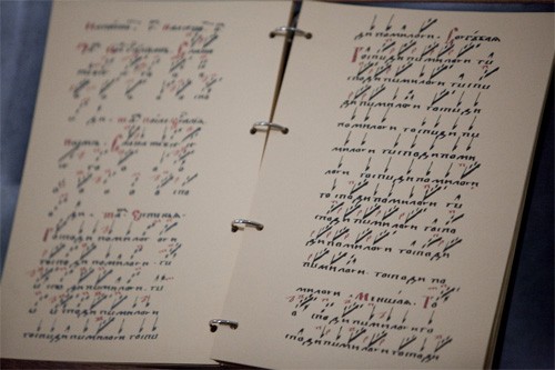 Крюковая нотация: над текстом пометки в виде галочек и крюков. Каждый знак обозначает определенный мелодический ход