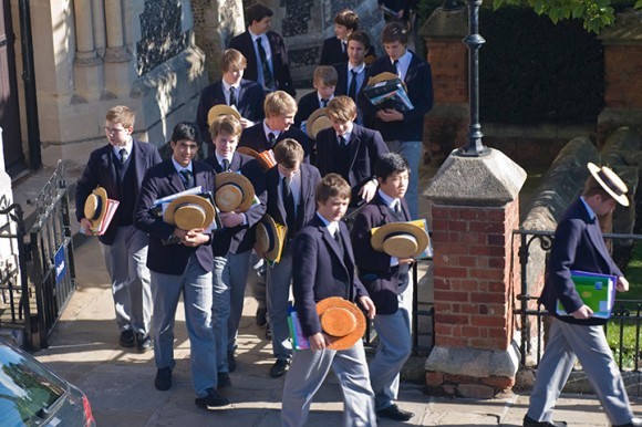 В школьную форму учеников школы Харроу входят не только привычные нам брюки и пиджаки, но и традиционные для этого учебного заведения соломенные шляпы.