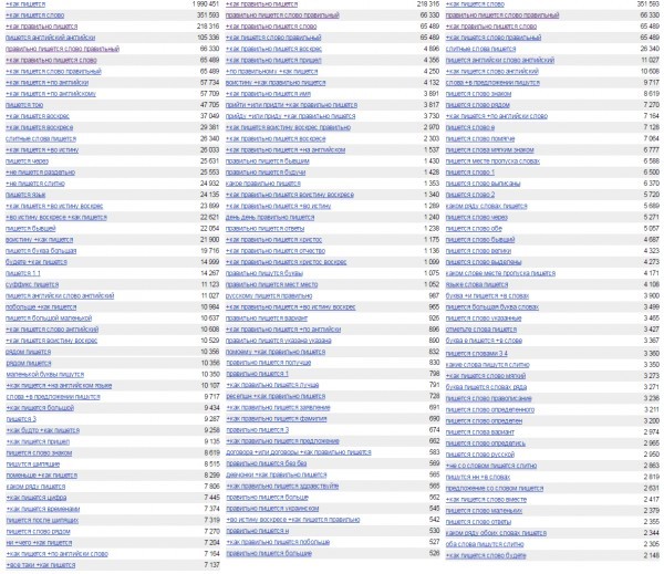 На первом месте по запросам — орфография. Чаще всего в этом году искатели грамотности вводили в строку поиска вопросы «Как пишется…» (в среднем 2 тысячи запросов в месяц), «Как пишется слово…» (от 215.000 до 239.000 запросов в месяц) и «Как правильно пишется…» (от 359.000 до 426.000 запросов в месяц).