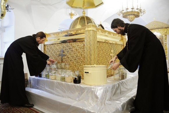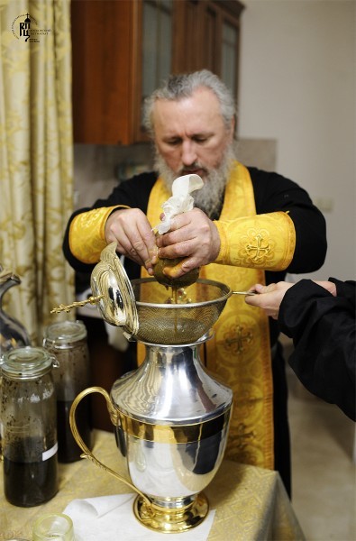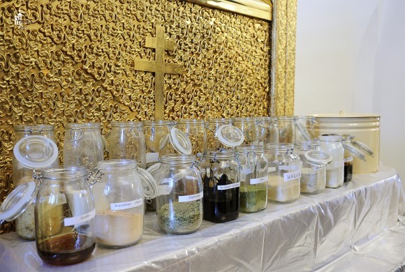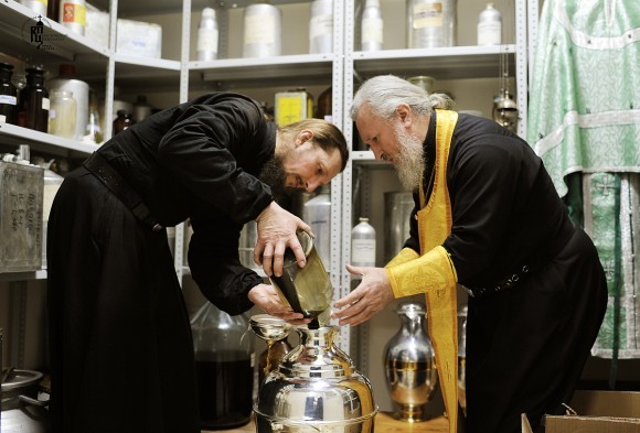 На протяжении нескольких недель Великого поста насельники Троице-Сергиевой лавры и Донского монастыря, а также сотрудники художественно-производственного предприятия Русской Православной Церкви «Софрино» готовили емкости для чина мироварения и заготавливали различные компоненты для изготовления святого мира. 21 марта, в среду 4-й седмицы Великого поста, Крестопоклонной, управляющий делами Московской Патриархии митрополит Саранский и Мордовский Варсонофий совершил в Малом соборе Донского монастыря водосвятный молебен и окропил освященной водой приготовленные для мироварения ингредиенты. Затем благовония были смешаны со специально подготовленным елеем.