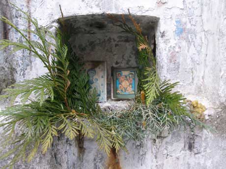 На Иверской горе, где останки старинной крепости и развалины храма, в маленькой часовенке лежит Акафист Божьей Матери. На нем приписка: «Напечатан и заламинирован на средства, оставленные паломниками». Пока мы долго в тумане поднимались на гору – путь по петляющей дороге занимает много времени – нам встретился всего лишь один человек. На вершине – рабочие, и трое «туристов», приехавших сюда на машине. Последние не очень трезвы, по всей видимости, один из них местный, двое других – его гости. Он с гордостью рассказывает о том, что здесь такое: «вот тут источник, вот здесь был храм». Местные жители вообще с удовольствием рассказывают о достопримечательностях своего родного Нового Афона, хотя и сами о них знают не так много. Но гордятся – ведь, если сюда приезжает столько верующих и просто любопытных, то значит, здесь и правда чудеса.