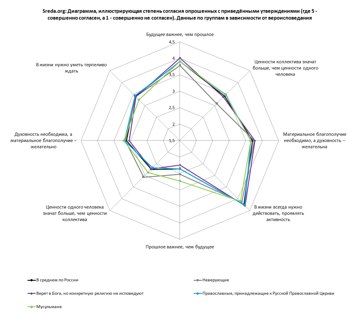 - Наибольшую роль прошлое играет для мусульман; представителей этой группы также характеризует наименьшая среди россиян ценность умения терпеливо ждать.