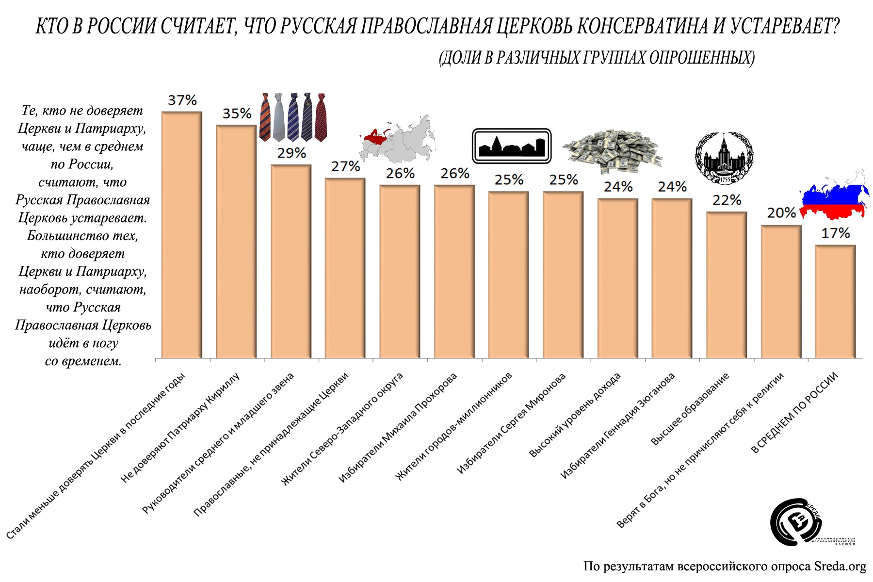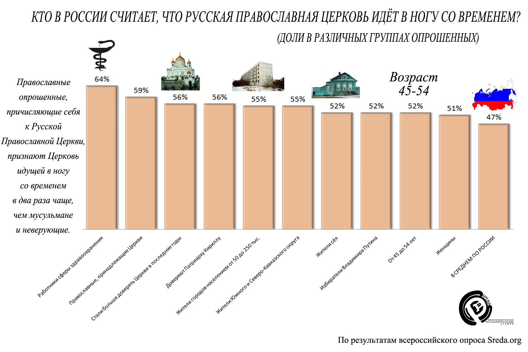 По данным опроса некоммерческой исследовательской службы «Среда» — «Русская Православная Церковь: устаревающая или современная?»,