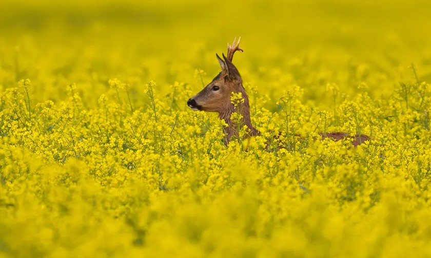 Косуля с усами Пуаро ведет свое расследование в рапсовом поле. Фото: Патрик Плейль/dpa