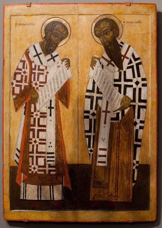 Святители Иоанн Златоуст и Василий Великий. Фрагменты Царских врат. Первая половина XVI века. Вологодские земли. Частное собрание (Москва).