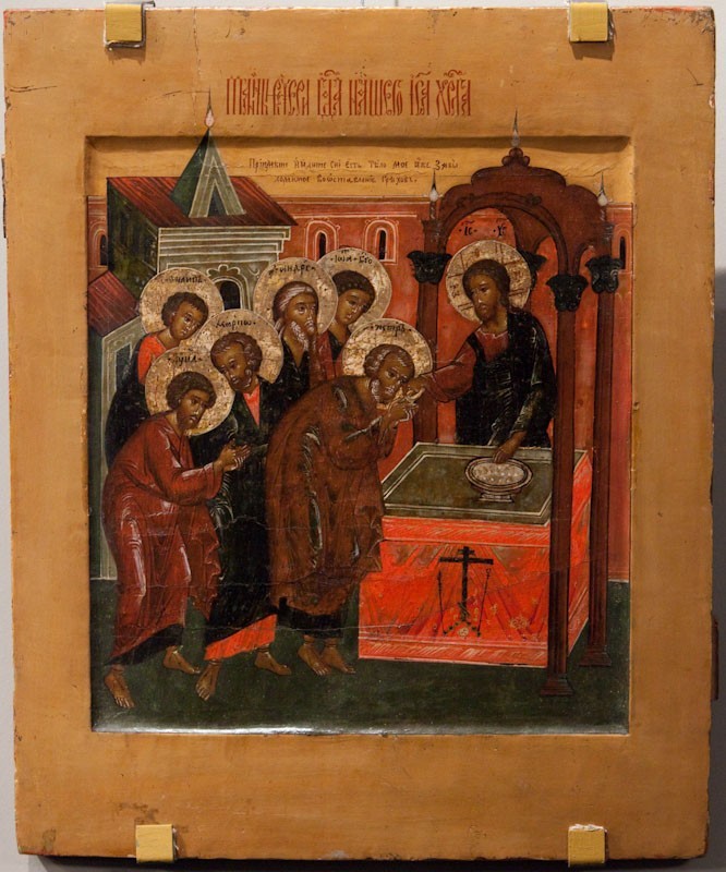 Евхаристия (Причащение хлебом). Фрагмент Царских врат. Первая половина XVII века; старообрядческая реставрация (врезок). Музей русской иконы (Москва). Инв. № ЧМ-44.