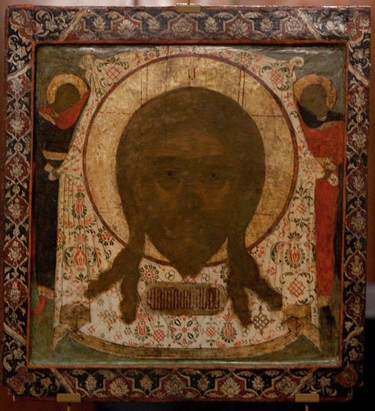 Двусторонняя икона-хоругвь. Спас Нерукотворный – Богоматерь Всех Скорбящих Радость. Последняя четверть XVII века. Кострома. Дерево, темпера. Происхождение не установлено. Находилась в собрании В.С.Самсонова. Поступила в музей в сентябре 2007 года от вдовы коллекционера. Реставрирована в 2007 г. Н.Б.Антонышевой (ГРМ), повторно – в 2099 г. Д.И.Нагаевым (МРИ) и в 2010 г. Инв. № ЧМ-265.