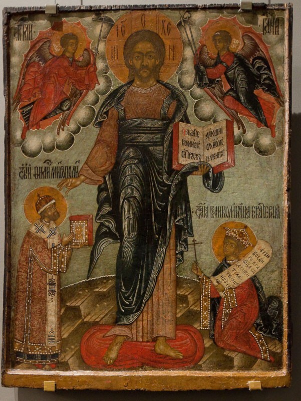 Спас Вседержитель со святителем Филиппом Московским и великомученицей Екатериной. Начало XVII века. Собрание А.В.Новикова (Москва).