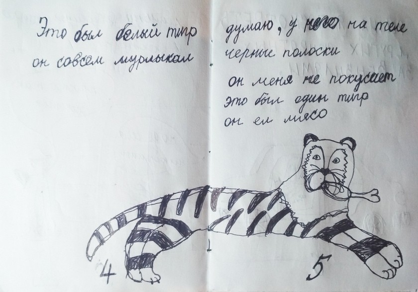 — Вместо этого он рассказал не настоящую историю, а о реальности, о которой мечтал. «История» — это сильно сказано для небольшой зарисовки. Но сильнее здесь то, что он разрешил себе сделать так, как ему хочется. Наблюдая, как тяжело ему дается каждая новая страница, как он не уверен в себе, как будто бы он сам взял и пошел гулять в неизвестном месте, я удивлялась одновременно размеру страха перед каждым предложением и картинкой и, в то же время, смелости открытия своих желаний. На глазах происходило простое чудо, в которое полезно поверить и мне самой: будет так, как я захочу, никто кроме меня не знает, как должно быть, нет никакого «должно».