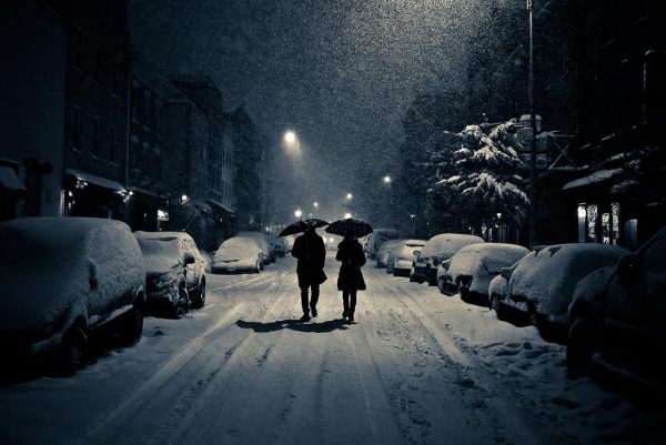 Из арки выплывают двое. Две тени за снежным маревом. Силуэт согнувшегося мужчины в сером длинном пальто, в черной ушанке на голове и тонкой женщины в куртке в облипочку, с высокой прической, прикрытой платком.