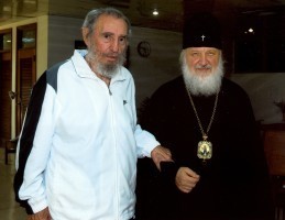 In this Oct. 20, 2008 photo made available on Nov. 13, 2008 by the Russian Orthodox Church, Cuba’s former President Fidel Castro, left, stands with Russia’s Metropolitan Kirill, of Smolensk and Kaliningrad, in Havana. Cuba’s first Russian Orthodox cathedral was inaugurated on Oct. 19, 2008. (AP Photo)