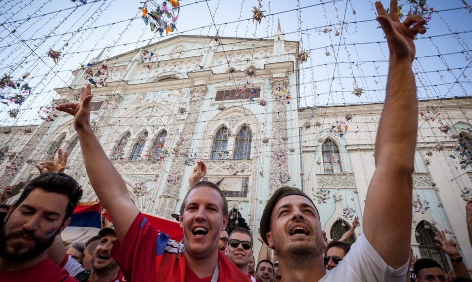 Перед собором Казанской иконы Божией Матери, что на углу Красной площади и Никольской улицы, растянули огромный флаг, поют и танцуют сербы. Среди кричалок своим и чужим явно слышится обращение с молитвой к Богу. В глубине Никольской, где стихийно развернулся фан-лагерь сербских болельщиков, непонятно на что забравшись, возвышается над толпой мужчина в национальной сербской одежде. Раззадоривая земляков, он также не забывает периодически креститься.