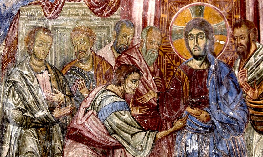 Уверение Апостола Фомы. Фреска монастыря Влахерна близ Арты, Греция. Середина XIII века. Фрагмент