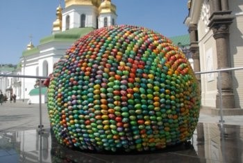 Пример удачного сотрудничества современных авторов и Церкви. Арт-объект из писанок «Сфера возрождения» художницы Оксаны Мась на территории Свято-Успенской Киево-Печерской Лавры