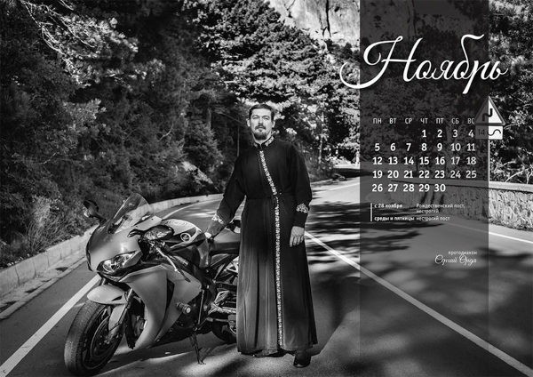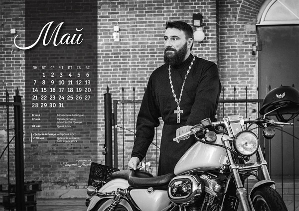 — Совершенно верно. Мы долго думали, как дать понять людям, которые смотрят этот календарь, что этот бородатый мужик — действительно священник. Сначала хотели сделать коллаж из двух фотографий: одна — где он в рясе в храме, а вторая — где он рядом со своим мотоциклом. Но это натыкалось на серьезные трудности, потому что календарь мы делали собственными силами и вынуждены были привлекать множество фотографов, поскольку священники-участники проекта живут в разных регионах России…