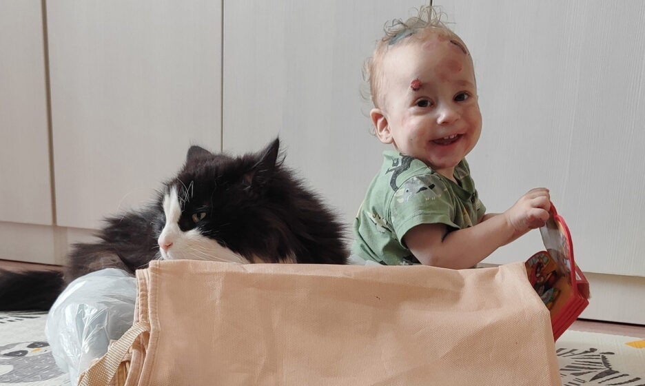 В футболке, больше похожей на длинную сорочку, годовалый Максим ползет на кухню вслед за мамой. Он открывает дверцы кухонного шкафчика и вытаскивает на пол содержимое: кастрюли, сковородки. Вертит их в руках, а потом снова кладет на полку. Когда ревизия закончена, малыш поворачивается к маме. «Ух!» — с улыбкой выдыхает он и проводит рукой по лбу, случайно задевая мокнущие язвы. Они начинают кровоточить, а он — громко плакать от боли. Анна вытирает бинтом кровь и обнимает сына: «Солнышко, мы обязательно тебя вылечим! Ты будешь самым здоровым и красивым!»