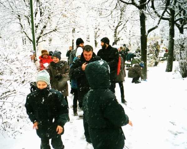 Идем по двору Духовной академии. Отец Николай Цирке, наш провожатый студент Духовной академии Михаил, дети из хора Знаменского собора города Тюмени, и я, в которого только что залепили снежком.