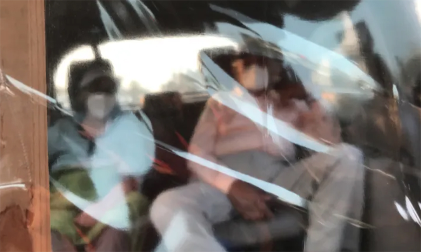 Родители автора за пластиковой перегородкой, которую они соорудили в своем фургоне. Фото: COURTESY OF DIPTI BAROT