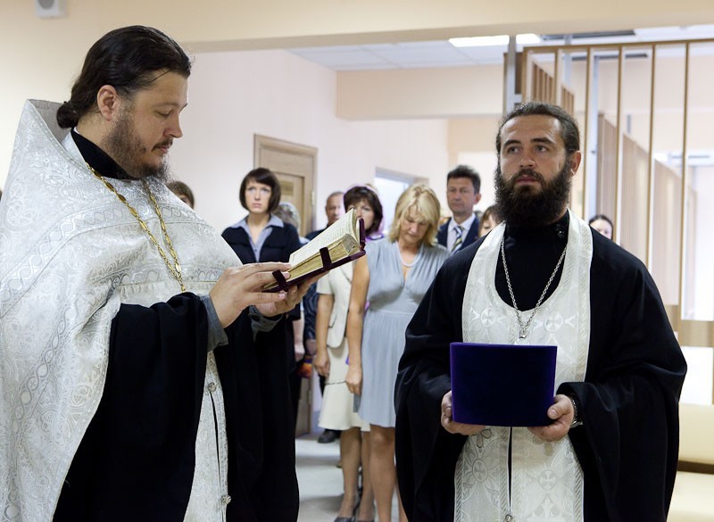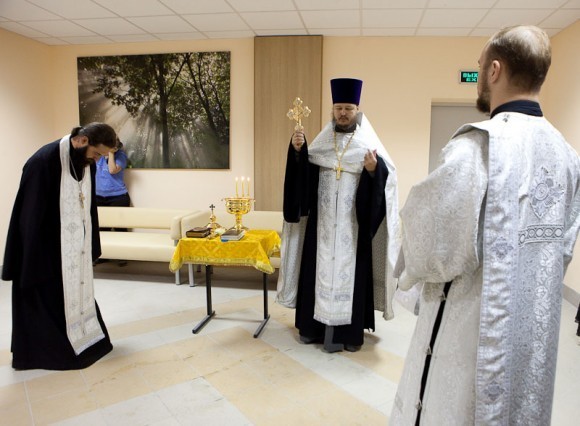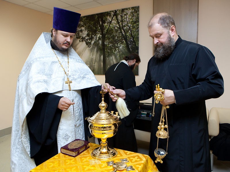 Начало чина освящения. В центре отец Михаил Трутнев, слева иерей Сергий Агафонов священник храма Архистратига Михаила и диакон Виктор Тишковец