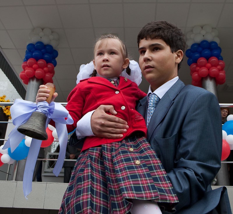 Торжественный момент Первого звонка, выпускник Илья и первоклашка Анечка