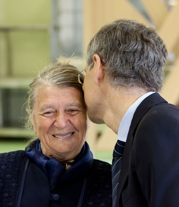 Николай Цветков со своей первой учительницей: «Я рад, что сегодня сейчас со мной моя первая учительница — это чудо! Мы уже все деды, а наша первая учительница еще не «дед»! И еще и молодая и активная. Всем бы нам вот такого здоровья, такой жизнерадостности, активности!»