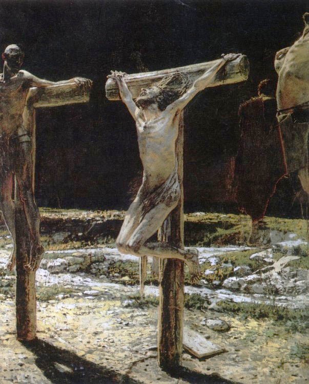 «Распятие» (1892). Начал работу в 1884 году. Павел Третьяков, увидев «Распятие», не стал покупать картину: она показалась ему нехудожественной. «Да от этой картины у иного еще вера может пропасть!» — говорит князь Мышкин Рогожину, глядя на копию с работы Ганса Гольбейна младшего. «Это в полном виде труп человека, вынесшего бесконечные муки», — произносит другой персонаж «Идиота», Ипполит. Все это и вспоминается перед картиной Ге. «Ге, как и многие из российской интеллигенции, в сущности, не был верующим христианином. Все здание христианских догматов о Воскресении (…) воспринималось им головой, а не сердцем», — пишет доктор искусствоведения Глеб Поспелов. «Я сам плачу, смотря на картину», — слова художника. Плакать хочется – от безысходности. Поскольку Воскресение, если смотреть на эту картину – не кажется возможным. На картине – торжество смерти. У художника были мысли уничтожить работу, но он не успел: 17 января он закончил вариант «Распятия» (утерян), а 1 июня этого же года Николая Николаевича Ге не стало. Российские зрители увидят «Распятие» впервые –постоянное «место жительства» картины — музей Д’Орсе в Париже.