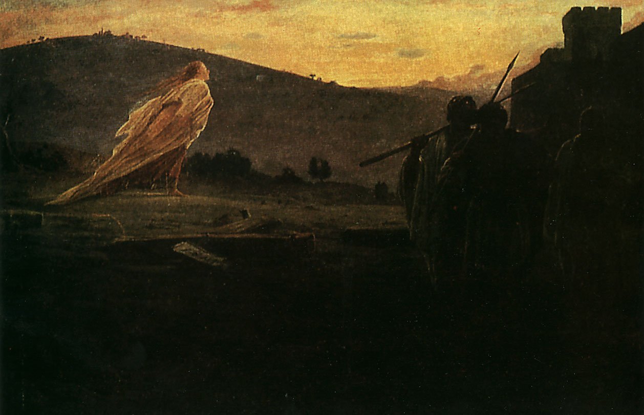 «Вестники Воскресения» (1867). Работать над картиной начал во Флоренции. Когда полотно было готово, его не приняли на выставку в Академию художеств. Потом все-таки выставили – в художественном клубе, но успеха она не имела. Произведение словно поделено на две части – света и тьмы, новой жизни и ветхой. В верхней, радостной – Мария Магдалина бежит, почти летит, окрыленная Радостью. В темной – стражники, Радость не принявшие… Стремительная фигура Марии Магдалины напоминает сказочную птицу. Критики – современники художника – увидели в ней «то ли сороку, то ли ласточку».