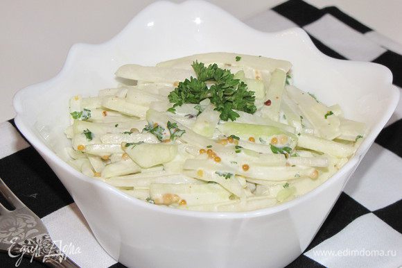 Кольраби и яблоки нарежьте тонкой соломкой. Сливки взбейте до «мягких пиков», добавьте горчицу, лимонный сок, петрушку и сахар. Заправьте салат.