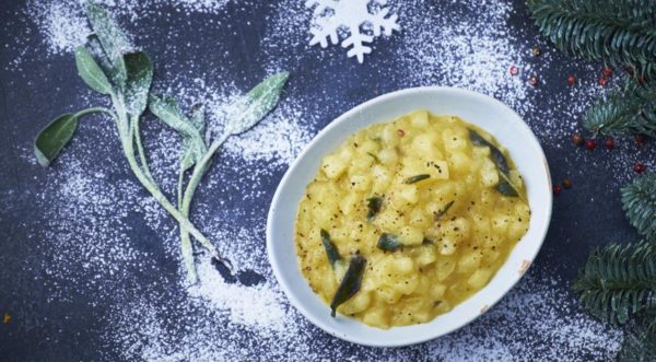 Отдельно в небольшой сковороде растопите 100 г сливочного масла, добавьте к нему листочки шалфея. Смешайте с яблоками и прогрейте 1 минуту. Подавайте приправу теплой к мясным блюдам.