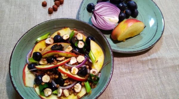 Перемешайте чечевицу с фруктами и луком, добавьте соль и перец по вкусу. Сбрызните оставшимся маслом и посыпьте рублеными орехами.