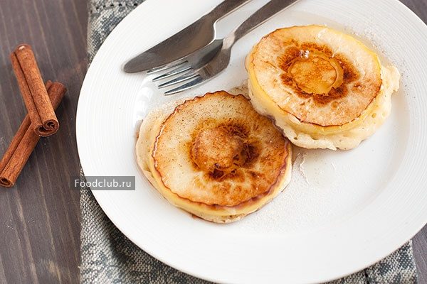 У яблок удалите серединку и нарежьте их колечками толщиной 3-5 мм. На сковороде разогрейте масло. Наливайте на сковороду немного тесто, а сверху выкладывайте яблочное кольцо. Жарьте с 2 сторон до готовности.