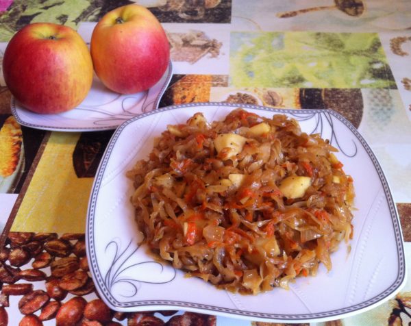 Смешайте капусту с яблоками, луком, свеклой, корицей, гвоздикой, сахаром и соком лимона.