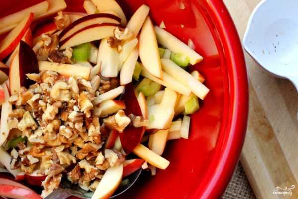 Яблоки нарежьте тонкими брусками и залейте лимонным соком. Добавьте мелко нарезанный сельдерей, грецкие орехи, изюм. Заправьте салат медом, сметаной и йогуртом.