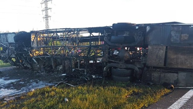 МВД сообщило, что водитель автобуса 1961 года рождения совершил столкновение с движущимся в попутном направлении грузовиком, буксируемым на жесткой сцепке автомобилем КамАЗ. После удара автобус опрокинулся и загорелся.
