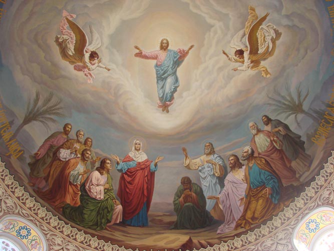 Согласно этим повествованиям, после Своего Воскресения из мертвых Спаситель неоднократно являлся ученикам, удостоверяя их в истинности Своего телесного Воскресения, укрепляя в них веру и подготавливая к принятию обетованного Св. Духа (ср.: Ин 16. 7). Наконец, повелев не отлучаться из Иерусалима и ждать обещанного от Отца (Лк 24. 49; Деян 1. 4), Господь Иисус Христос вывел учеников из города в Вифанию, на гору Елеон (Деян 1. 12), и, подняв Свои руки, подал им благословение, а затем стал отдаляться от них и возноситься на небо. В Деяниях св. апостолов описано, что, начав возноситься, Христос был сокрыт облаком, и тогда явились «два мужа в белой одежде», которые возвестили Его Второе пришествие. Ученики же поклонились Ему и с радостью вернулись в Иерусалим (Лк 24. 52), где через несколько. дней на них сошел Св. Дух (Деян 2. 1-4).