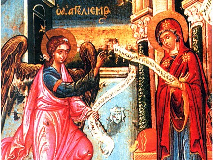 Ангел явился в дом праведного Иосифа, когда Мария читала Священное Писание, и возвестил ей, что она родит Сына, который будет велик и назовется Сыном Всевышнего. Мария в недоумении спросила Ангела: «как это будет, когда Я мужа не знаю?» Ангел ответил Ей: «Дух Святой найдет на Тебя, и сила Всевышнего осенит Тебя; посему и рождаемое Святое наречется Сыном Божиим».