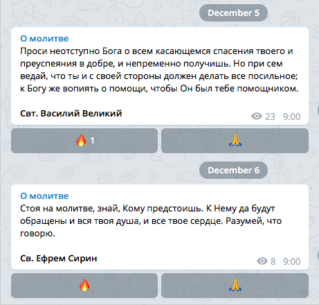 Молодой канал, на который подписан всего 21 человек. Как следует из названия – он про молитвы. Авторы канала ежедневно публикуют цитаты из книг православных святых.