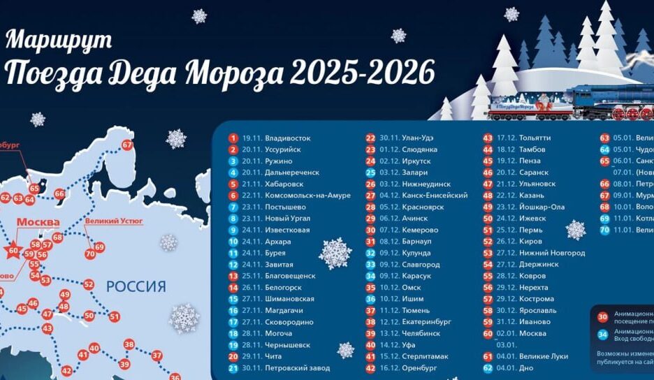 Путешествие начнется 19 ноября во Владивостоке и завершится 11 января 2026 в Великом Устюге — родном городе главного новогоднего волшебника.