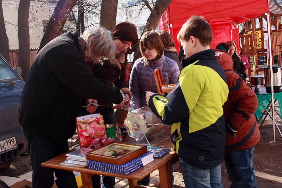 Настя ТерлецкаяСреди всего этого праздника особенно отрадно было смотреть на детей, для которых во дворе храма было организовано пространство для игр и творчества. Можно было с помощью аква-грима перевоплотиться в любой персонаж, усовершенствовать мастерство плетения косичек или раскрасить ангелов и пасхальные яйца. Более серьезный уровень был представлен мастер-классом по портрету художницы и педагога Марины Лейзольд. И, конечно, не обошлось без горячего чая и угощений, а также традиционной беспроигрышной лотереи.