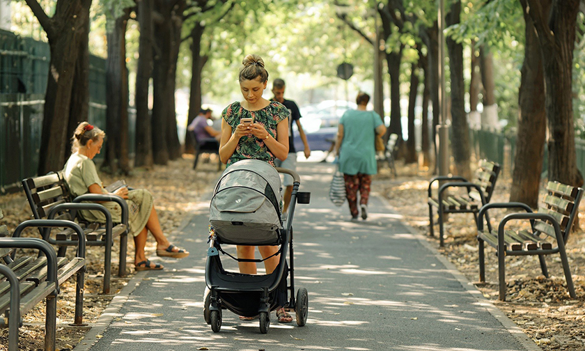 У качелей мама в голубом худи — на телефоне: «Я сказала тебе не видео мне снять. Сфотографируй мне эти развороты учебника. Ой, ну Николь, куда ты бежишь, качели!»