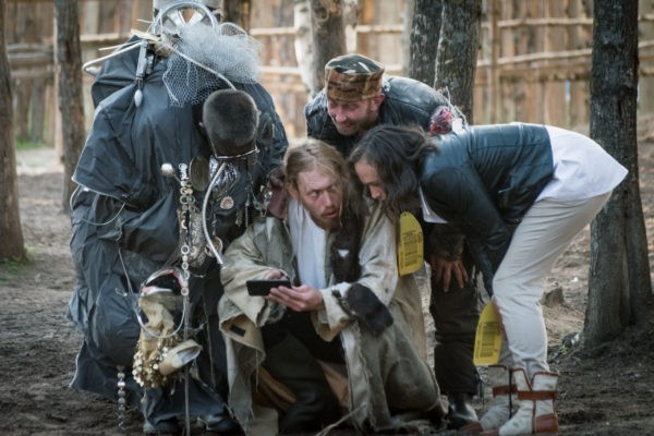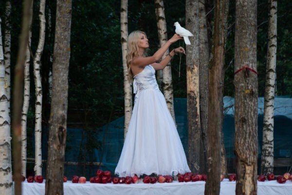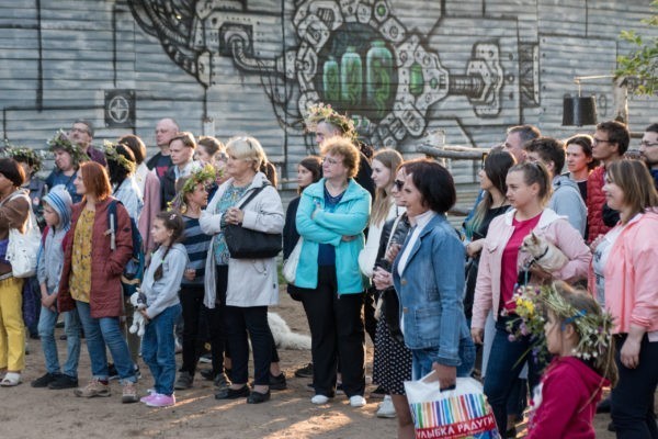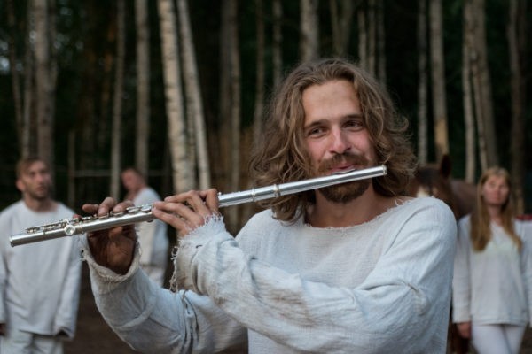 Кто-то сидит вокруг костра, кто-то плетет венки на мастер-классе. Другие пьют кофе и разглядывают сувениры. Обстановка расслабленная. Но, похоже, остальные, как и я, мало ориентируются, что здесь будет происходить. Администратор объясняет, что во время спектакля мы куда-то будем передвигаться. Может быть, на крытую площадку? Пока что всех декораций — только небо, деревья и снопы сена, по которым, повизгивая от удовольствия, лазают дети.