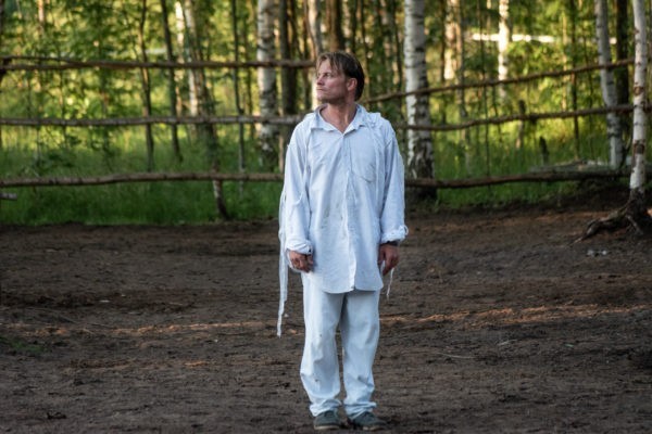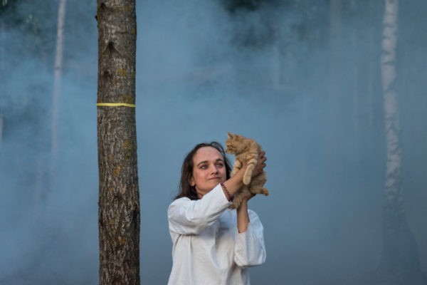 Откуда-то из леса прибегает белая пушистая собака, явно здешняя, улыбается всем подряд. Дети ее тут же начинают гладить. Дети, кстати, вообще, в отличие от скованных взрослых, чувствуют себя здесь органично и сразу встраиваются «в предлагаемый контекст»: сено так сено, собака так собака, по бревнам походить, так по бревнам походить. Им, похоже, даже не приходит в голову задумываться о концепции «природного театра»: правила игры они чувствуют интуитивно. И чуть позже, на самом спектакле, будут активнее взрослых участвовать, подсказывать, вовлекаться и переживать.