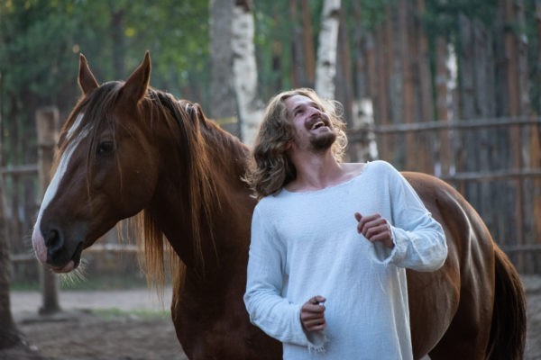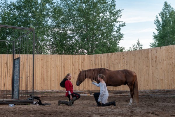 По счастливому стечению обстоятельств, нужный специалист нашелся совсем рядом, в соседней деревне. Инна Дитманн — тренер мирового масштаба и основатель Школы свободных лошадей. Она сотрудничает с театром уже три года: плодами совместной работы стали три поставленных спектакля. Как и Парелли, Инна проповедует общение на принципах партнерства, без болевого воздействия и наказания.