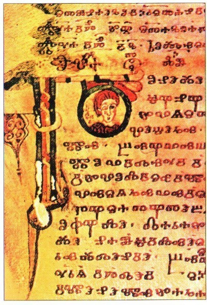 Алфавитом, который создал Константин, была не известная нам кириллица, а глаголица. Вот на экране страничка из глаголического Ассеманиева Евангелия, просто для того чтобы было представление, как выглядела глаголическая письменность.