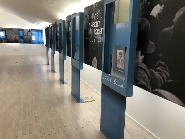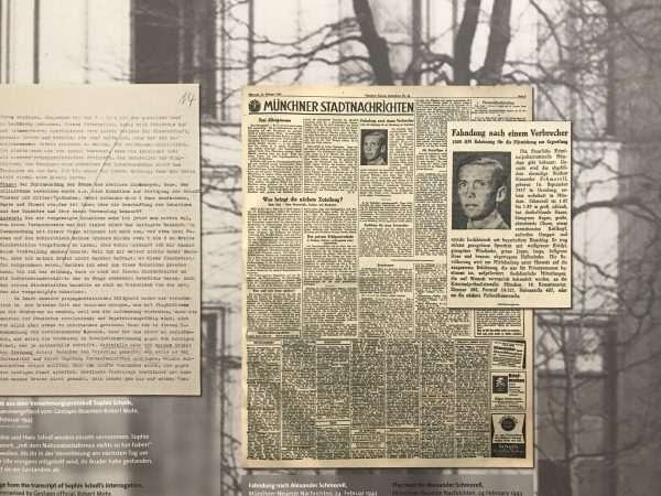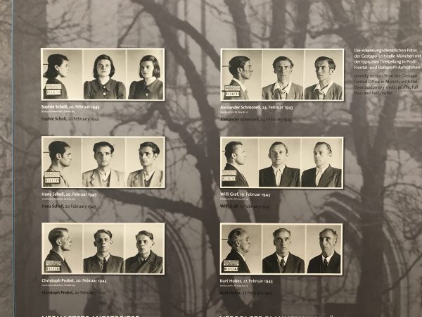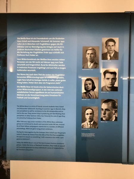 Здание мюнхенского университета совершенно пустое. Профессура и студенты отдыхают на пасхальных каникулах. Университет место публичное, поэтому мы легко и беспрепятственно входим в красивый старинный вестибюль. Детский топот по мраморным лестницам гулко отзывается в стенах пустого здания. Спускаемся куда-то вниз, кажется, в подвал. Не оставляет ощущение, что идем по проторенной дорожке. Так и есть, небольшой зал мемориальной экспозиции полон народа. Кто-то бурно обсуждает экспонаты, кто-то листает интерактивные альбомы, кто-то шуршит страницами папок с данными на каждого участника группы «Белая Роза».